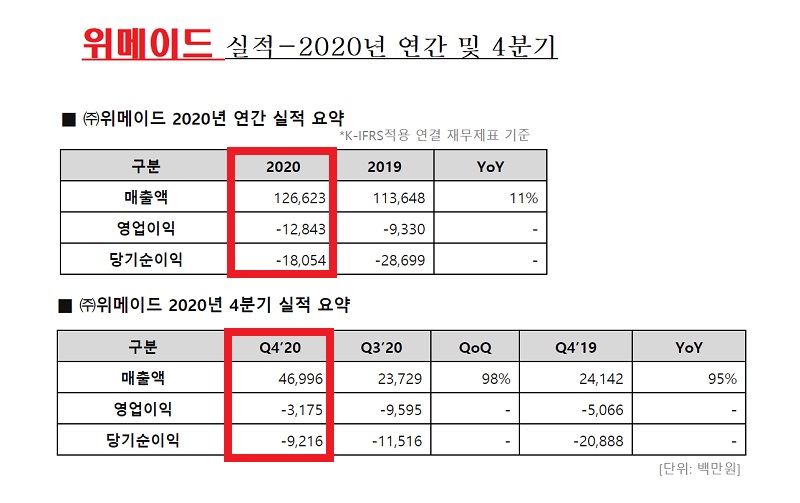 2월 10일 위메이드(대표 장현국, [112040])는 10일(수) 2020년 연간 및 4분기 실적을 발표했다.