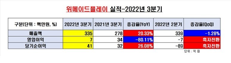 연결기준, 위메이드플레이(대표 이호대) 3분기 매출은 335억원이다. 영업이익과 당기순이익은 각각 6억7000만원과 40억7000만원이다.