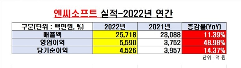 22년 매출 2조5718억, 영업이익 5590억, 당기순이익 4526억원