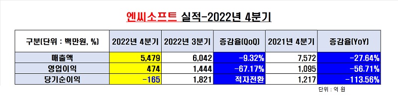 엔씨소프트의 2022년 4분기는 부진했다. 매출 5479억원, 영업이익 474억원으로 전년동기대비 각각 28%와 57% 줄었다. 전분기(22년 3분기)보다는 9%와 67% 감소했다.
