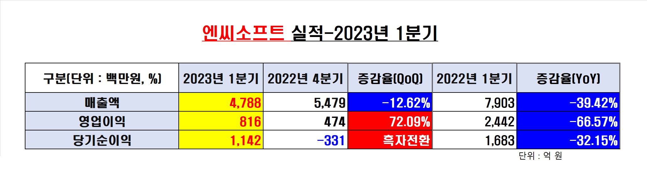 엔씨소프트(대표 김택진, 이하 엔씨(NC))가 2023년 1분기 실적을 발표했다.