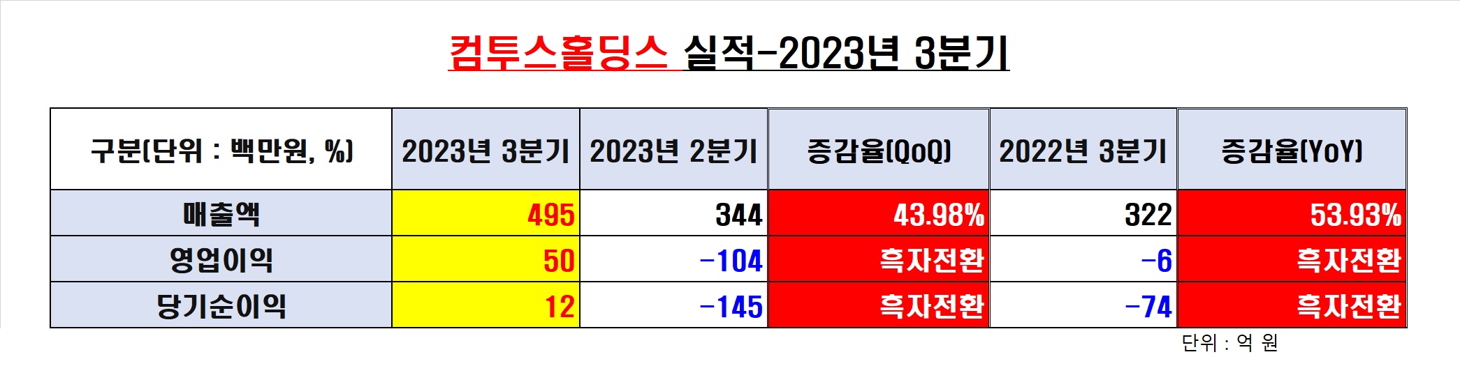 매출 495억, 영업익 50억, 당기순이익 12억원 기록