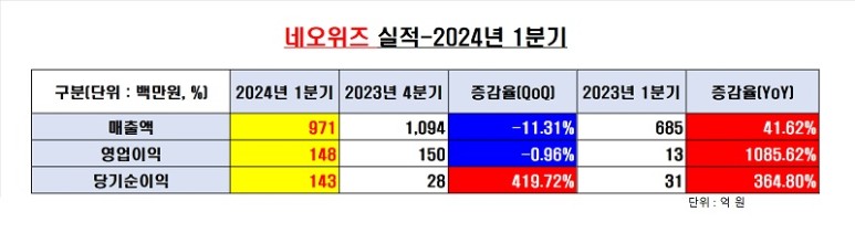 한국채택국제회계기준(K-IFRS), 네오위즈 1분기 매출은 971억 원, 영업이익은 148억 원이다. 전년 동기 대비 각각 42%, 1,085% 증가한 수치다.