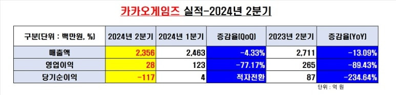 카카오게임즈(대표 한상우)가 2024년 2분기 실적을 발표했다.