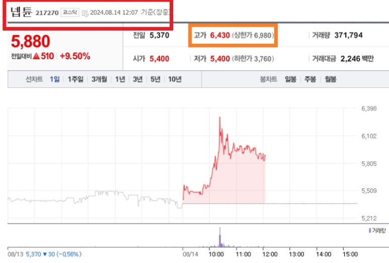 8월 14일 넵튠 주식 장중 19% 넘게 상승, 크래프톤 지분 보유 부각