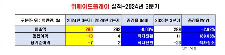 위메이드플레이가 2024년 3분기 실적이 곤두박질쳤다.