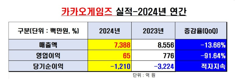 카카오게임즈도 지난해 성과를 발표했다. 매출과 영업이익이 각각 7388억원, 65억원으로 전년대비 13.6%, 91.6%가량 감소했다. 당기순손실은 1210억원으로 적자폭이 줄었다.