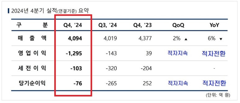 연결 기준, 2024년 매출이 1조5781억원으로 전년비 11.33% 감소했다. 영업손실은 1092억원으로 적자전환했다. 당기순이익은 941억원으로 2023년(2139억원) 절반에도 미치지 못했다.