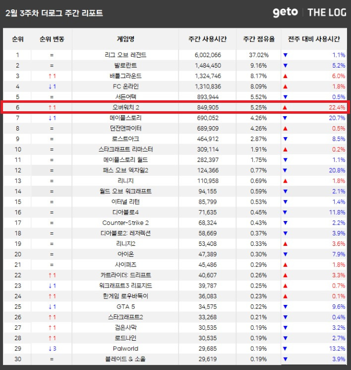 게토PC방 기반 통계 서비스 '더로그'의 2월 3주차 PC방 주간 순위를 공개했다. 블리자드의 '오버워치2'가 22%가량 증가, 6위로 한 계단 올랐다.