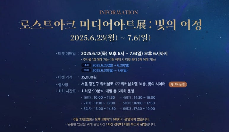 빛의 여정은 ‘빛으로 재탄생한 아크라시아’를 주제로 로스트아크가 7년의 라이브 서비스 기간 동안 쌓아온 방대한 세계관과 깊이 있는 서사를 영상과 음악이 어우러진 미디어아트로 감상할 수 있는 전시다.