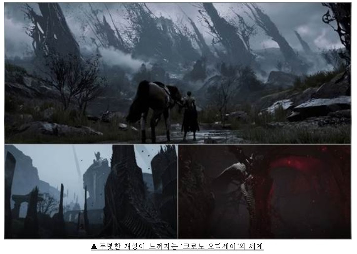 우선 ‘크로노 오디세이’는 ▲언리얼 엔진5로 구현한 광활한 오픈월드 ▲심미성과 사실감을 겸비한 다크 판타지 세계관 ▲시간을 조작하는 ‘크로노텍터’ 시스템 기반의 독창적인 전투 ▲ 정밀하고 묵직한 수동전투 액션 ▲시간의 흐름에 따라 변화하는 자연스러운 낮과 밤 등 다양한 요소를 통해, 글로벌 이용자에게 차별화된 경험을 제공할 예정이다.