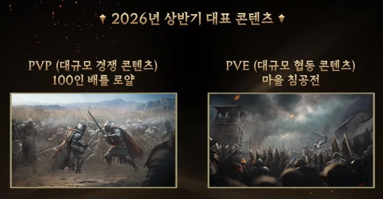 PvP(대규모 경쟁 콘텐츠) '100인 배틀 로얄'과 PvE(대규모 협동 콘텐츠) '마을 침공전' 등이다.