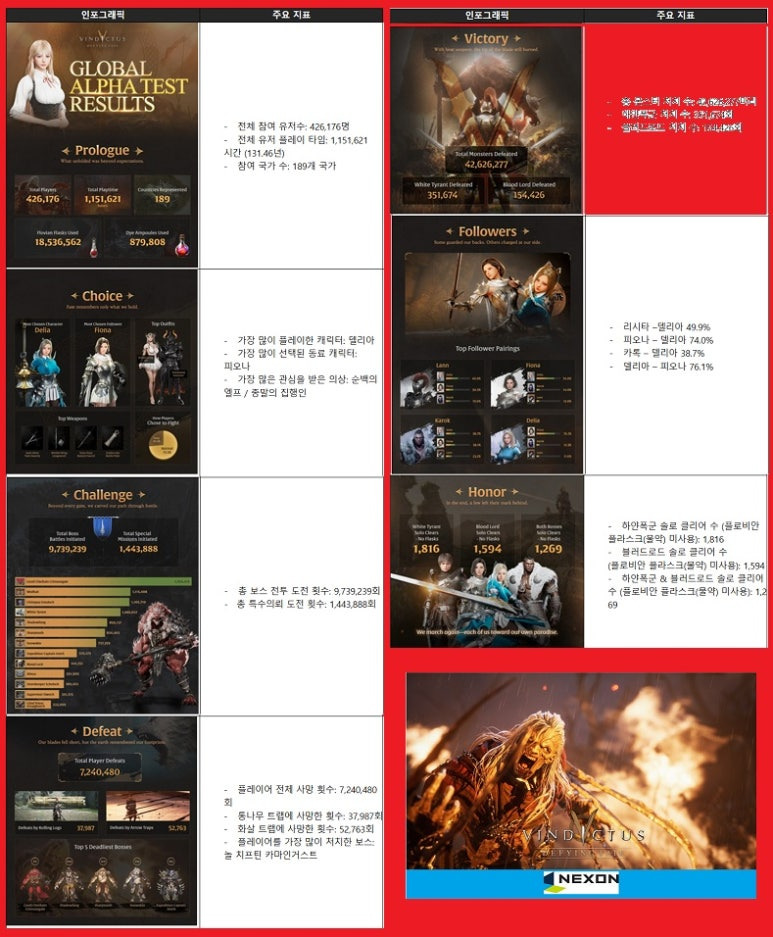 넥슨은 '빈딕투스' 글로벌 알파 테스트에 42만6176명이 참여했다고 밝혔다. 전체 플레이 타임은 11만1621시간이다.