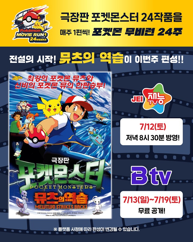 재능TV, SK브로드밴드와 함께 ‘극장판 포켓몬스터’ 시리즈 총 24편을 TV 및 VOD 플랫폼에서 특별 편성 프로모션 ‘포켓몬 무비런 24주’를 7월 12일부터 12월 20일까지 매주 토요일 방영한다.