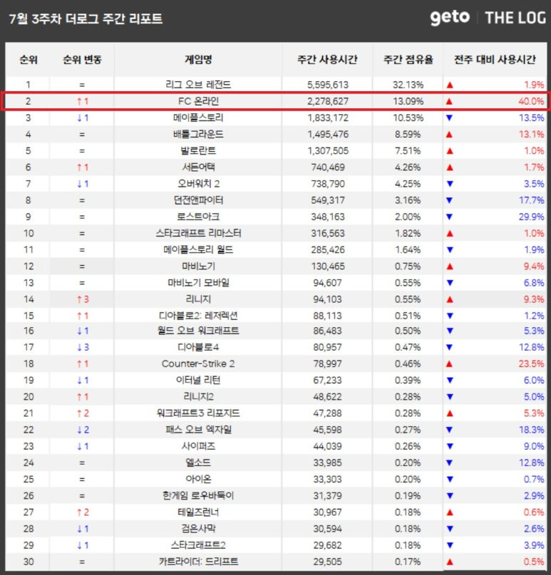 게토PC방 기반 통계 서비스 '더로그'의 7월 3주차 온라인게임 순위를 공개했다. 넥슨의 축구 게임 'FC온라인'이 이전대비 40% 증가, 넘버2를 되찾았다.