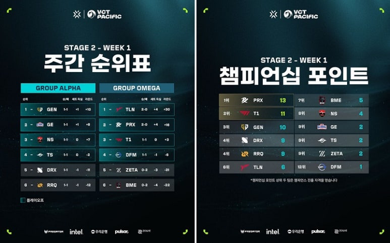 7월 15일부터 20일까지 상암 SOOP 콜로세움에서 열린 발로란트 게임대회 'VCT 퍼시픽 스테이지2'의 정규 시즌 개막 주차 결과를 공개했다. 알파 그룹에 속한 여섯 팀이 모두 1승1패를 기록했다.