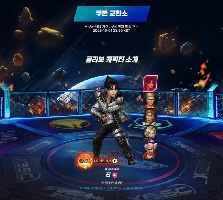 업데이트에 앞서 ▲‘카자마 진’ ▲‘폴 피닉스’ ▲‘니나 윌리엄스’ ▲‘화랑’ 그리고 ▲무료 지급 예정인 5성급 ‘미시마 헤이하치’ 등 컬래버 캐릭터 5종의 모습도 만나볼 수 있다.