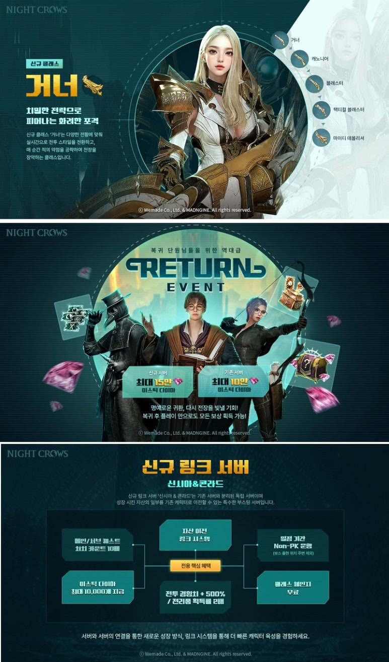 매드엔진에서 개발한 대작 MMORPG '나이트 크로우'에서 대규모 업데이트를 통해 링크 서버 ‘신시아’와 ‘콘라드’, 새로운 클래스 ‘거너’, 신규 격전지 ‘오베르 용암 성채’ 등을 공개했다.