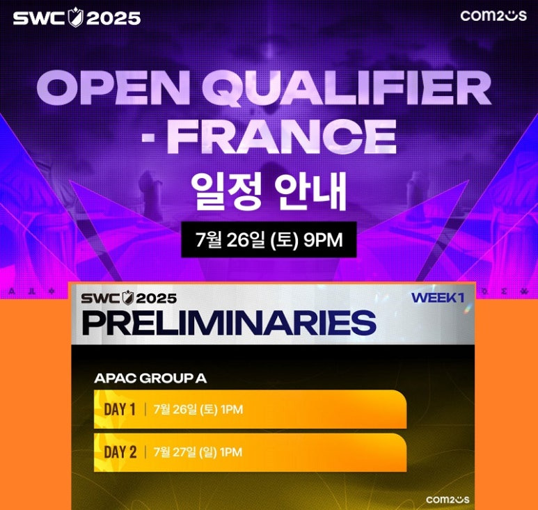 글로벌 e스포츠 대회 ‘서머너즈 워 월드 아레나 챔피언십 2025(SWC2025)’의 개막을 알리고 첫 지역 예선을 동남아과 프랑스에서 7월 26일부터 27일까지 개최한다.