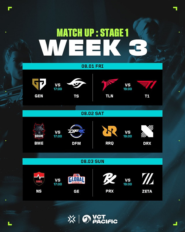 발로란트 게임대회 'VCT 퍼시픽 스테이지2' 3주 차에서 경기 일정을 공개했다. 젠지, DRX, T1 등 한국팀들이 플레이오프 확정을 놓고 경기를 치른다.