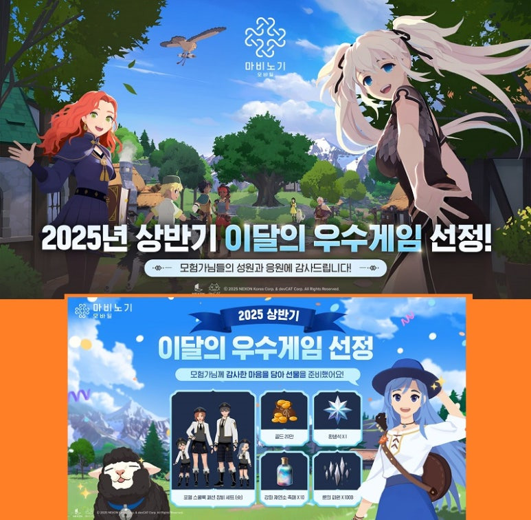 자회사 데브캣(대표 김동건)에서 개발한 MMORPG ‘마비노기 모바일’이 ‘2025 상반기 이달의 우수게임’ 일반게임 부문을 수상했고 이를 기념한 선물을 제공한다.