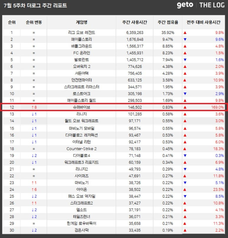 게토PC방 기반 통계 서비스 '더로그' 7월 5주차 온라인 게임 순위를 공개했다. 넥슨이 선보인 MOBA '슈퍼바이브' 169% 증가 이전보다 8계단 상승한 12위에 자리했다.