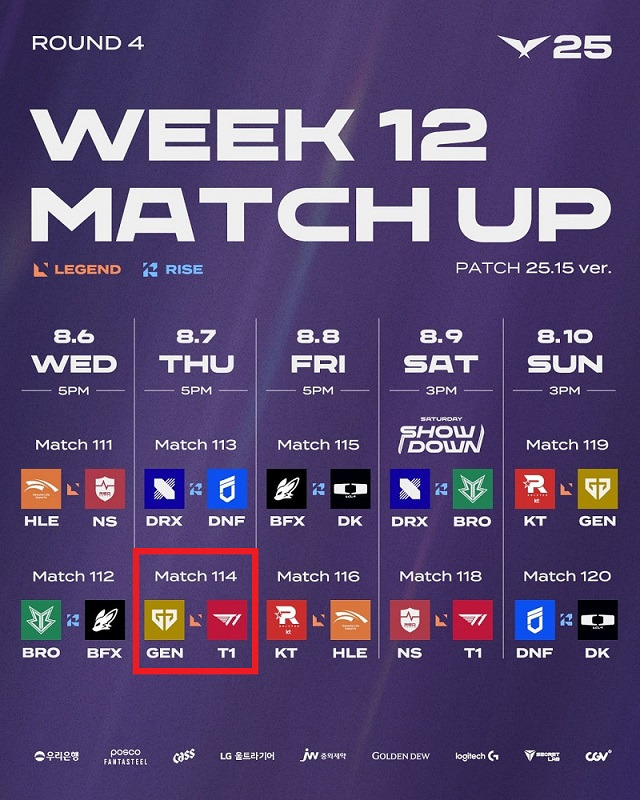 8월 6일부터 8월 10일까지 LCK 아레나에서 진행되는 '2025 LCK 4라운드' 1주 차 일정을 공개했다. 8월 7일 영원한 맞수 젠지와 T1이 경기한다.