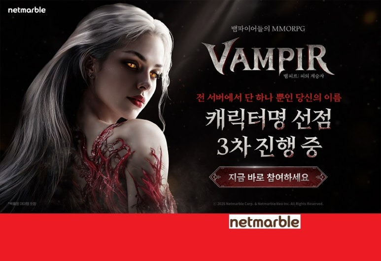 8월 26일 출시하는 뱀파이어 컨셉 MMORPG '뱀피르'의 1차, 2차 ‘캐릭터명 선점’ 이벤트가 조기 마감됨에 따라 3차 이벤트를 진행 중이라고 밝혔다.