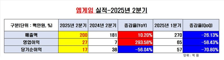 한편 엠게임과 넵튠 등은 2025년 2분기 실적을 공개했다. 비수기임에도 매출과 영업이익 등이 전년 동기 대비 개선됐다.