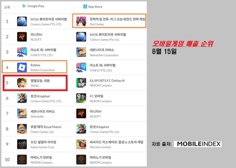신예 빅3(RF 온라인 넥스트, 마비노기 모바일, 세븐나이츠 리버스)는 물론 장수 흥행 톱3(WOS:화이트아웃 서바이벌, 라스트워: 서바이벌, 리니지M)까지 모두 추월했다.