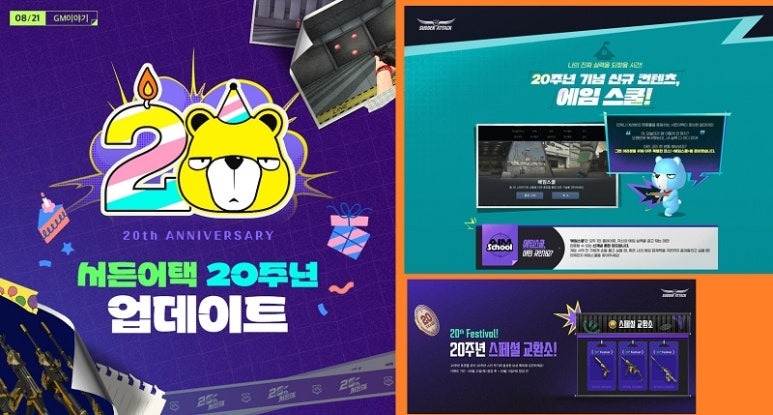 8월 23일 서비스 20주년을 맞이하는 인기 온라인 FPS 게임 ‘서든어택’에 신규 콘텐츠 ‘에임스쿨’, 신규 무기 ‘마이건 20th 니케’ 등 대규모 업데이트와 풍성한 이벤트를 펼친다. 8월 23일에는 생일파티 방송와 쇼케이스 등을 진행한다.