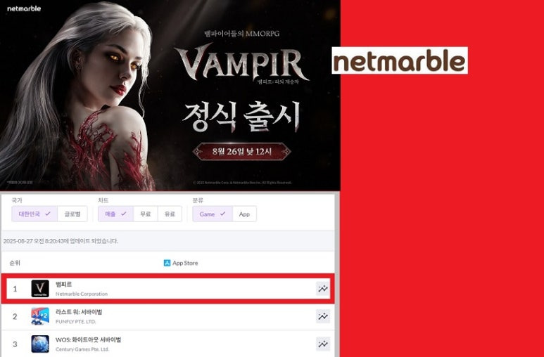뱀파이어 컨셉의 신작 MMORPG '뱀피르'가 출시 8시간만에 애플 앱스토어에서 매출 1위를 차지했다.