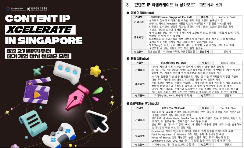 지난 8월 27일부터 지식재산(IP)을 기반으로 한 해외 시장 진출과 투자 유치를 지원하기 위해 ‘콘텐츠 IP 액셀러레이트 인 싱가포르(Content IP Xcelerate in Singapore)’의 참가 기업 12개사를 상시 모집한다.