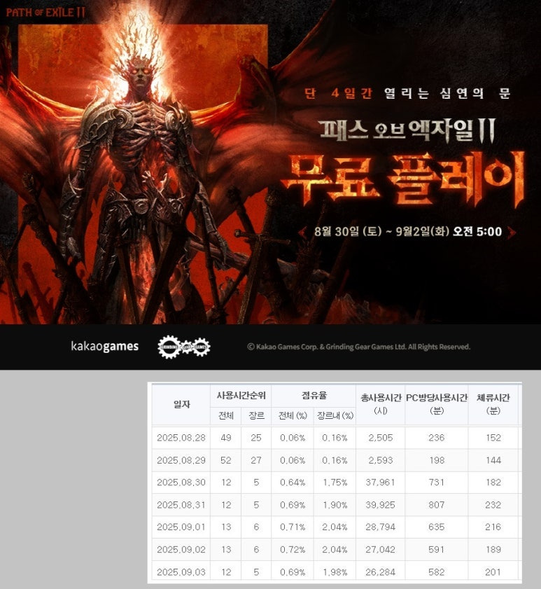 ‘패스 오브 엑자일 2’가 지난 8월 30일 신규 확장팩 ‘세 번째 칙령’을 공개 하루 만에 동시접속자 35만명을 돌파하며 스팀 접속자 3위에 올랐다. 국내 PC방 주간 순위도 이전보다 약 40계단 상승한 12위를 나타냈다.
