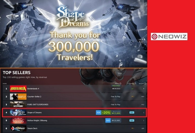 네오위즈는 최근 출시한 '셰이프 오브 드림즈' 초반 대흥행을 알렸다. 누적 판매량 30만장을 돌파하며 스팀 톱 셀러 4위에 오른 것. 최고 동시 접속자는 4만5000명을 찍었다.