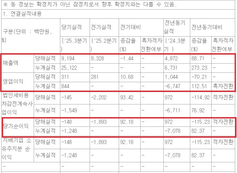 25년 3분기 실적을 발표했다. 연결 기준 3분기 매출액은 약 92억, 영업이익 약 3억, 당기순손실은 약 1억5000만 원이다.