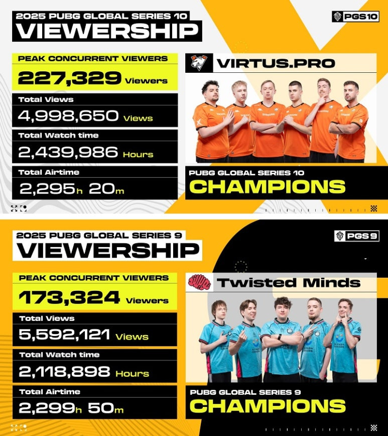‘PUBG: 배틀그라운드’의 글로벌 e스포츠 대회 ‘펍지 글로벌 시리즈(이하 PGS)’ 시즌 9과 10이 성료했다. 누적 시청시간이 455만이며 조회수는 1040만 회다.