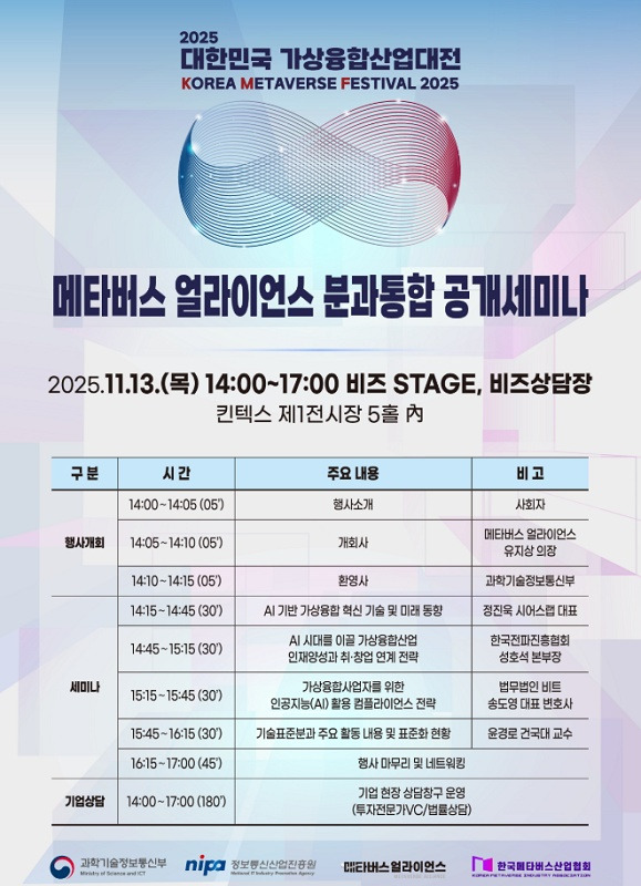 11월 13일(목) 오후 2시 일산킨텍스 제1전시장 5홀에서 ‘2025 메타버스 얼라이언스 분과통합 공개세미나’를 개최한다.