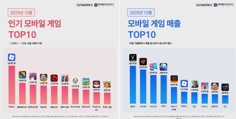 자사 데이터 분석 솔루션을 활용해 작성한 아이지에이웍스 모바일인덱스 기반 '10월 인기 앱·게임 순위 리포트'를 공개했다.