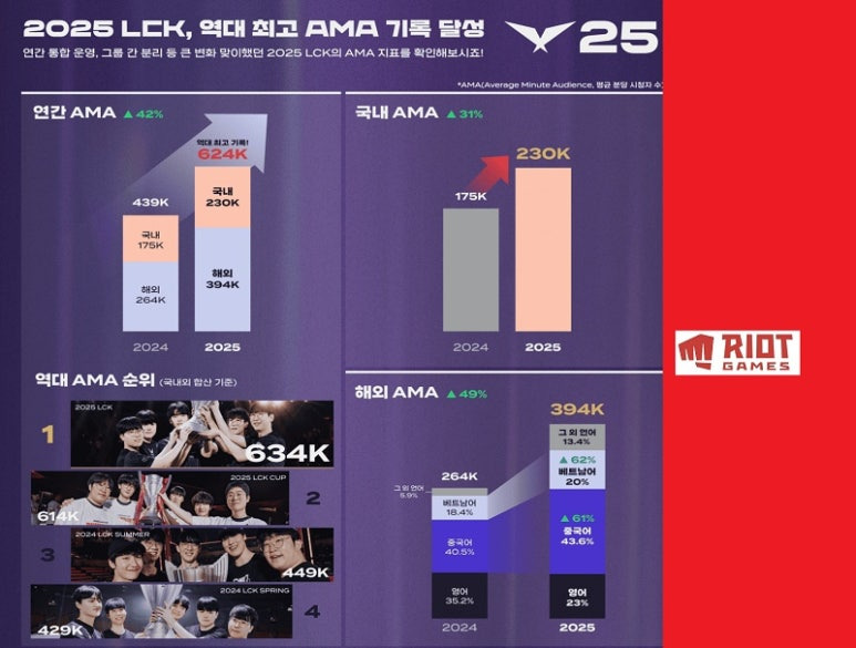 2025 LKC가 역대 최고 시청지표를 기록했다고 밝혔다. 평균 분당 시청자수가 63만4000으로 전년대비 42% 증가했다. 국내 시청자 연평균 20만 명을 돌파했다.