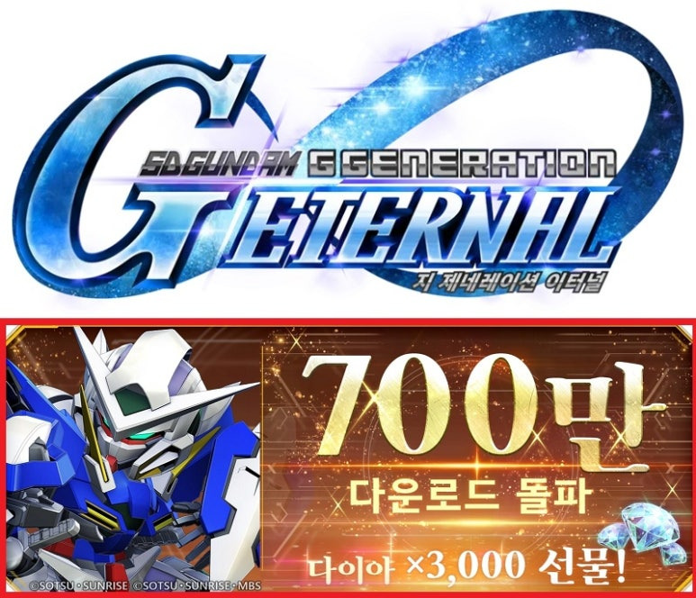 ‘SD건담 지 제네레이션 이터널‘의 글로벌 누적 다운로드 700만 건 돌파를 기념, 3000개 다이어를 전원 지급하며 신규 이벤트 '기동전사 건담 외전 더 블루 데스티니'에 나섰다.