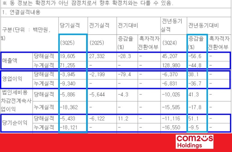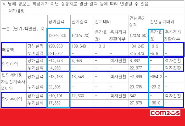 2025년 3분기 실적을 발표했다. 연결 기준 매출 196억500만원으로 전년 동기 대비 56.6% 줄었다. 영업손실과 당기순손실은 각각 39억4500만원, 54억3300만원이다. 적자폭이 감소했다.
