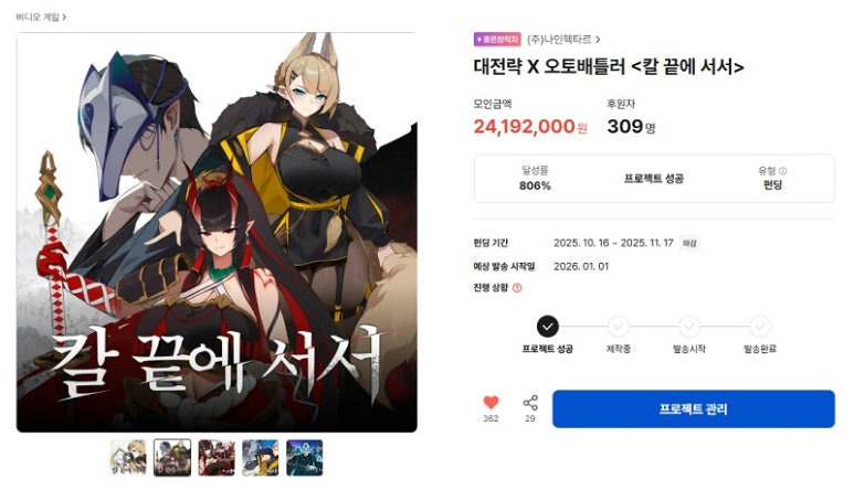 자체 개발 중인 서브컬처 전략 시뮬레이션 게임 ‘칼 끝에 서서’의 텀블벅 펀딩의 목표 금액을 806% 초과 달성했다고 밝혔다.