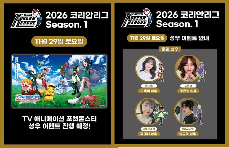 11월 29일과 30일 코엑스 전시장 B1 홀에서 개최되는 포켓몬 카드 게임 ‘2026 코리안리그 시즌1’에서 성우 이벤트를 실시한다. 이새벽·조현정·장예나·심규혁 등이 참여한다.