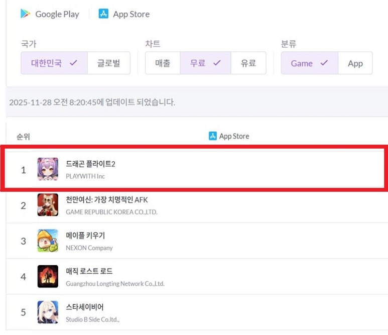 비행 슈팅 게임 ‘드래곤 플라이트2’가 11월 27일 출시 당일, 애플 앱스토어 무료 게임 인기 순위 1위에 올랐다고 밝혔다.