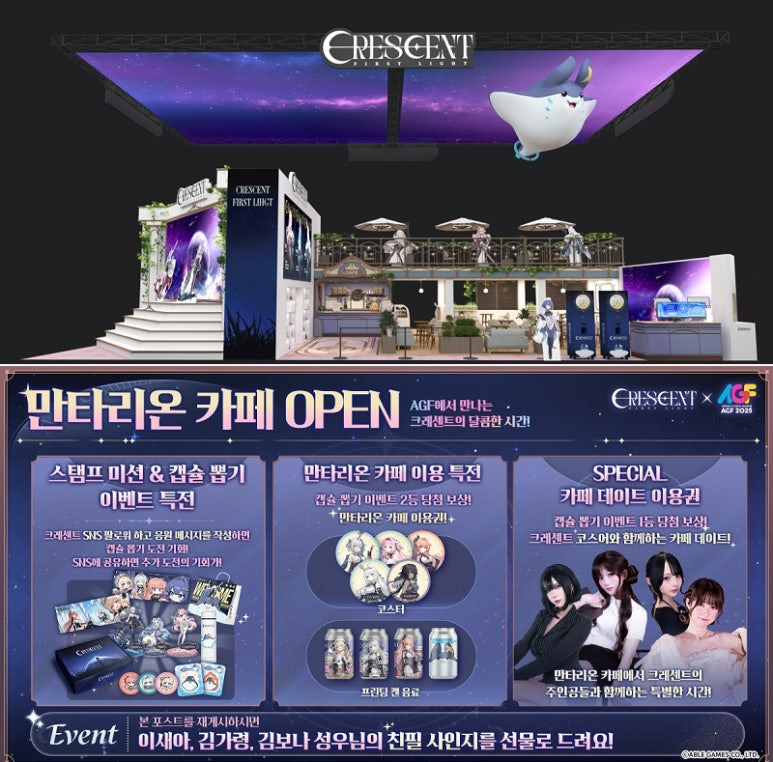 자체 개발 중인 수집형 서브컬처 RPG ‘크레센트(Crescent)’의 AGF 2025 부스에서 풍성한 보상을 제공하는 다양한 참여형 이벤트를 진행한다.