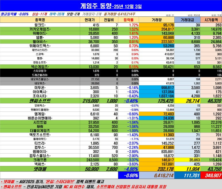 | 반등! 게임주, 시총은 감소…크래프톤·엔씨 하락 (0) | 2025.12.01 |