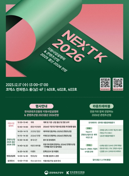 12월 17일 서울 코엑스에서 ‘NEXT K 2026 : 지원사업 설명회 및 콘텐츠산업 2025 결산·2026 전망’을 개최한다. 25년 콘텐츠산업 주요 성과를 정리하고, 2026년 전망과 지원 정책 방향을 국민과 산업계에 공유하기 위함이다.