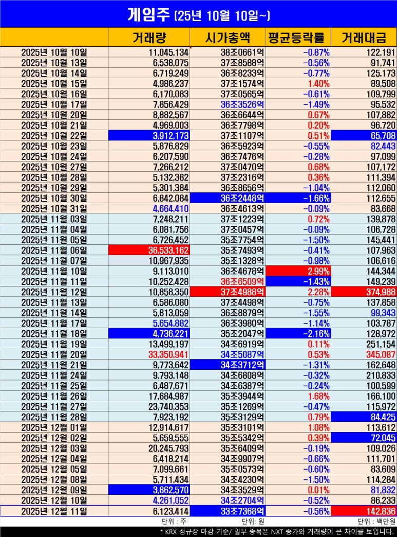 | [주간등락률]끝모를 하락! 게임주, 거래 뚝+34조 붕괴 (0) | 2025.12.13 |