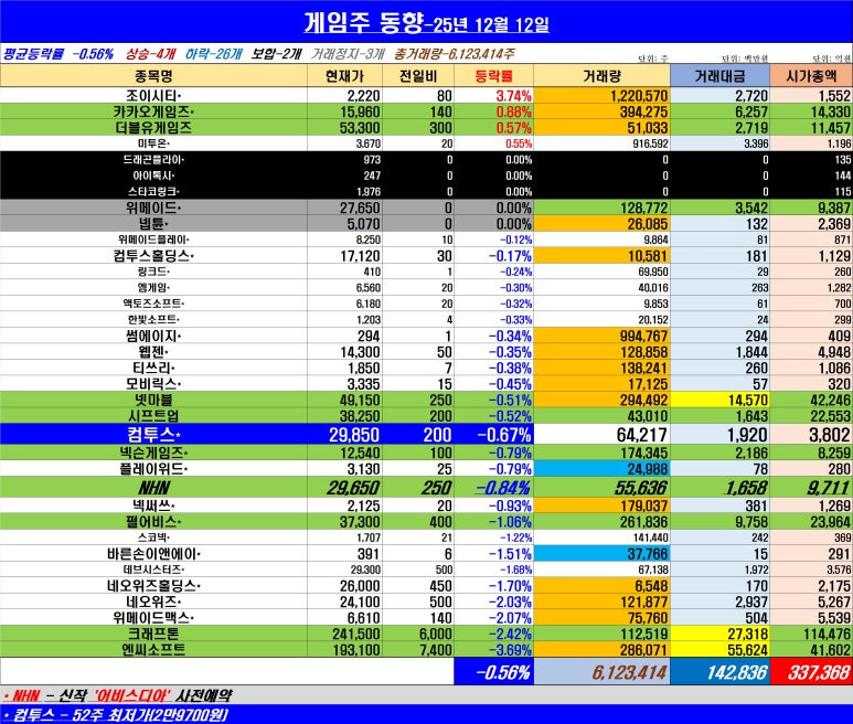 게임주식은 평균등락률 -0.56%다. 12월 9일 찔끔 반등(+0.01%) 이후 2거래일 연속 부진이다.